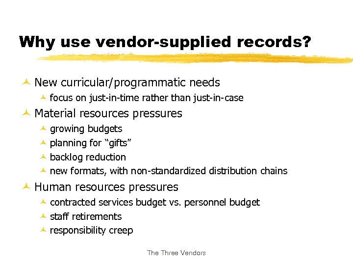Why use vendor-supplied records? © New curricular/programmatic needs © focus on just-in-time rather than just-in-case © Material resources pressures © growing budgets © planning for “gifts” © backlog reduction © new formats, with non-standardized distribution chains © Human resources pressures © contracted services budget vs. personnel budget © staff retirements © responsibility creep The Three Vendors