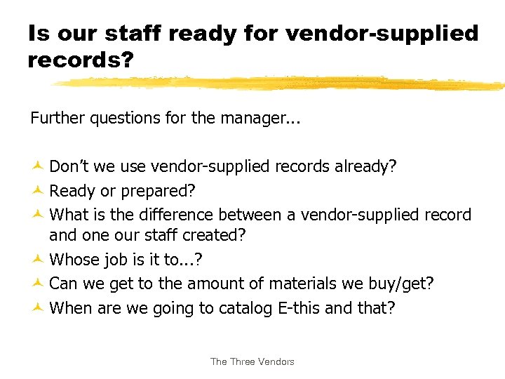 Is our staff ready for vendor-supplied records? Further questions for the manager. . . © Don’t we use vendor-supplied records already? © Ready or prepared? © What is the difference between a vendor-supplied record and one our staff created? © Whose job is it to. . . ? © Can we get to the amount of materials we buy/get? © When are we going to catalog E-this and that? The Three Vendors