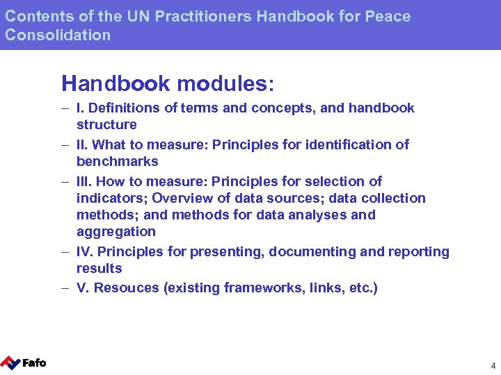 Contents of the UN Practitioners Handbook for Peace Consolidation Handbook modules: – I. Definitions of terms and concepts, and handbook structure – II. What to measure: Principles for identification of benchmarks – III. How to measure: Principles for selection of indicators; Overview of data sources; data collection methods; and methods for data analyses and aggregation – IV. Principles for presenting, documenting and reporting results – V. Resouces (existing frameworks, links, etc. ) 4