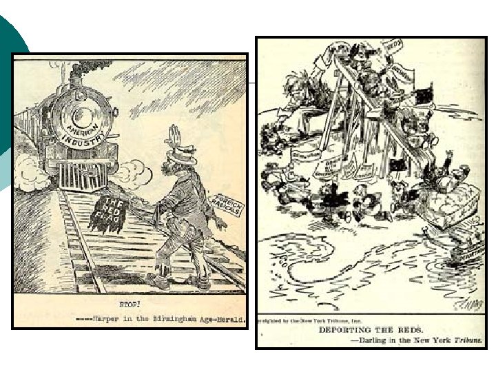 The Red Scare In the US ¡ ¡ ¡ ¡ Bolsheviks=socialists & communists Free speech vs. national security Anti-communist hysteria Labor strikes and protest Conservatives said reformers were socialists and wanted revolution Simplified political differences Used negative labels to stereotype, scare, and bully Squashed political dissent