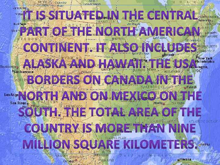 Natural attractions of the USA • There are many natural wonders in the USA. The most widely known is Niagara Falls. It is Falls an Indian word which means “roaring waters”. Other attractions are Yellowstone and Yosemite National Parks, Grand Canyon, and the vast desert between Salt Lake City and Reno, Nevada.