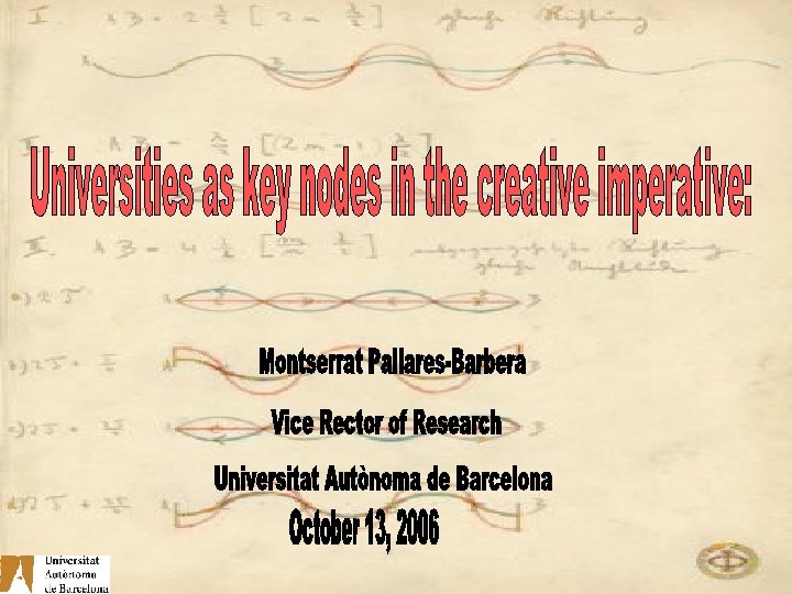 The Universitat Autònoma de Barcelona: University’s Research and Innovation. What are universities in nowadays? . Engines of knowledge based economy . Universities represent the advancements and innovation a country has. Creativity and national prosperity paradigm (Wince-Smith 2006)
