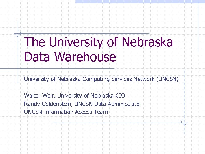 The University of Nebraska Data Warehouse University of Nebraska Computing Services Network (UNCSN) Walter Weir, University of Nebraska CIO Randy Goldenstein, UNCSN Data Administrator UNCSN Information Access Team