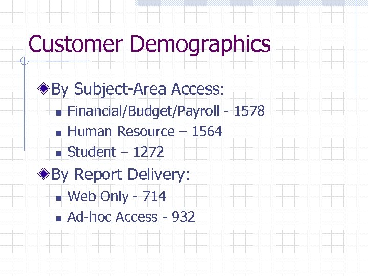 Customer Demographics By Subject-Area Access: n n n Financial/Budget/Payroll - 1578 Human Resource – 1564 Student – 1272 By Report Delivery: n n Web Only - 714 Ad-hoc Access - 932