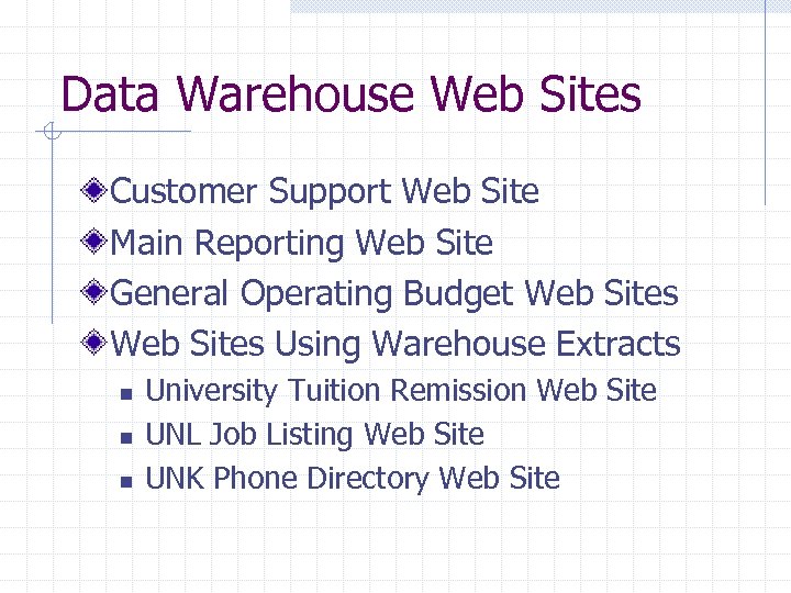 Data Warehouse Web Sites Customer Support Web Site Main Reporting Web Site General Operating Budget Web Sites Using Warehouse Extracts n n n University Tuition Remission Web Site UNL Job Listing Web Site UNK Phone Directory Web Site
