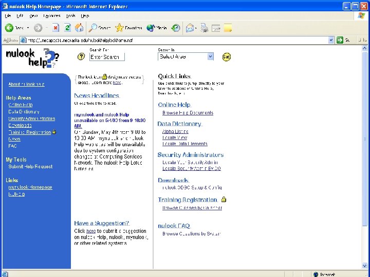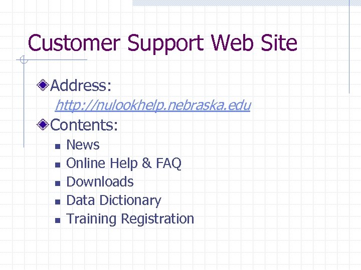 Customer Support Web Site Address: http: //nulookhelp. nebraska. edu Contents: n n n News Online Help & FAQ Downloads Data Dictionary Training Registration