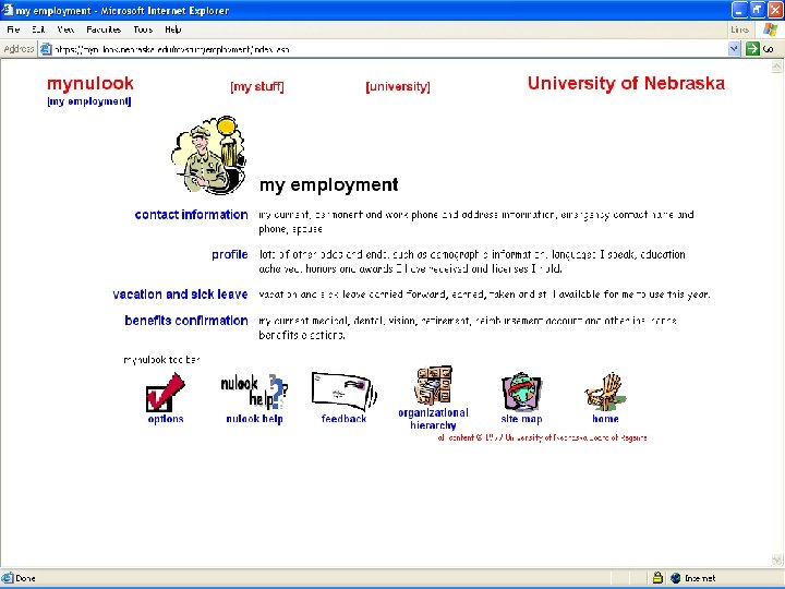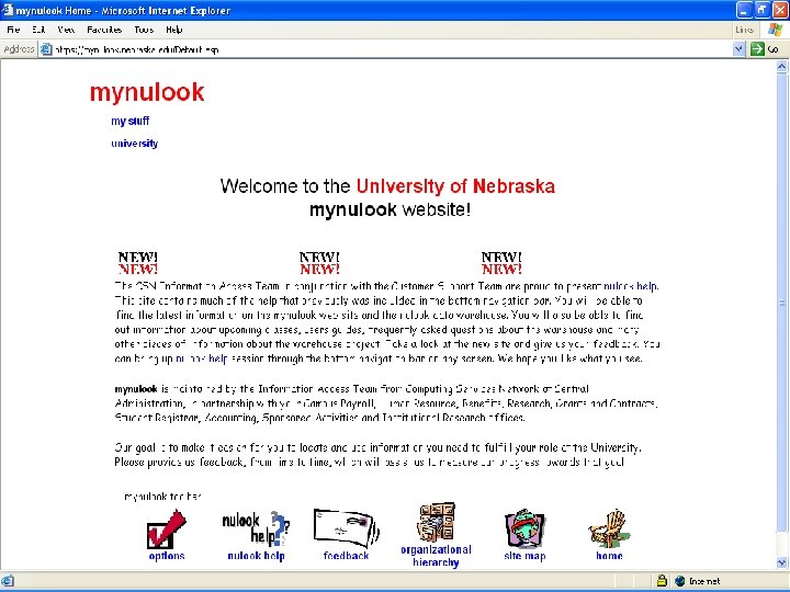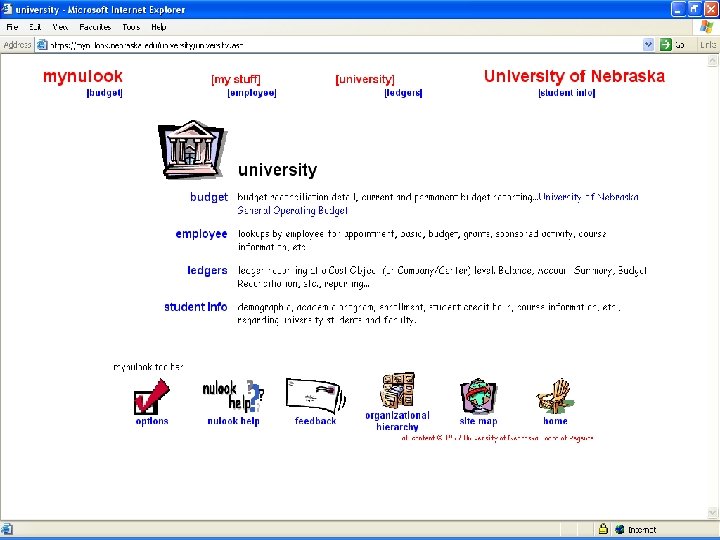 Main Warehouse Web Site Address: http: //mynulook. nebraska. edu Contents: n n Dynamic pre-defined reports Main developed reporting sections Personal Reports (‘my stuff’ section) n Employment information n Course and student reports n Sponsored activity reports University → Ledgers University → Employee University → Student Info