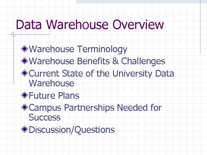 Data Warehouse Overview Warehouse Terminology Warehouse Benefits & Challenges Current State of the University Data Warehouse Future Plans Campus Partnerships Needed for Success Discussion/Questions