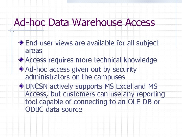 Ad-hoc Data Warehouse Access End-user views are available for all subject areas Access requires more technical knowledge Ad-hoc access given out by security administrators on the campuses UNCSN actively supports MS Excel and MS Access, but customers can use any reporting tool capable of connecting to an OLE DB or ODBC data source