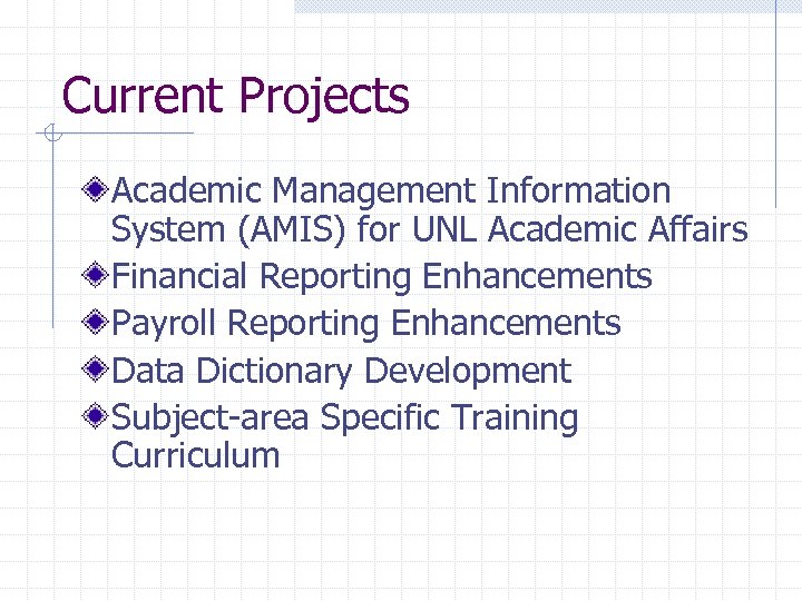 Current Projects Academic Management Information System (AMIS) for UNL Academic Affairs Financial Reporting Enhancements Payroll Reporting Enhancements Data Dictionary Development Subject-area Specific Training Curriculum