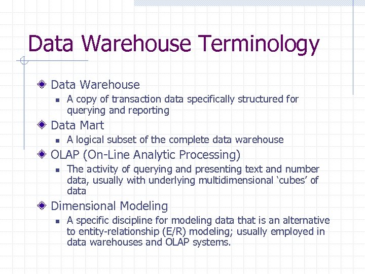 Data Warehouse Terminology Data Warehouse n A copy of transaction data specifically structured for querying and reporting Data Mart n A logical subset of the complete data warehouse OLAP (On-Line Analytic Processing) n The activity of querying and presenting text and number data, usually with underlying multidimensional ‘cubes’ of data Dimensional Modeling n A specific discipline for modeling data that is an alternative to entity-relationship (E/R) modeling; usually employed in data warehouses and OLAP systems.