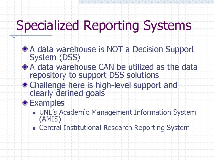 Specialized Reporting Systems A data warehouse is NOT a Decision Support System (DSS) A data warehouse CAN be utilized as the data repository to support DSS solutions Challenge here is high-level support and clearly defined goals Examples n n UNL’s Academic Management Information System (AMIS) Central Institutional Research Reporting System