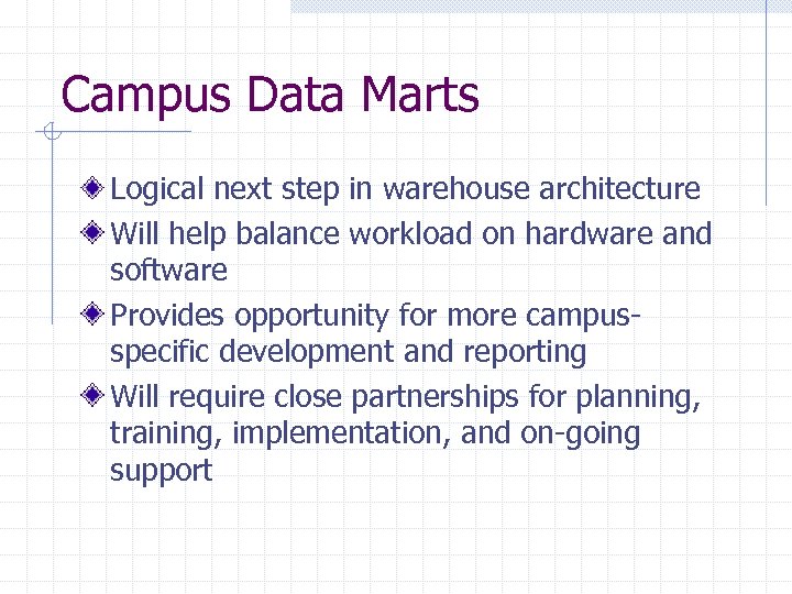 Campus Data Marts Logical next step in warehouse architecture Will help balance workload on hardware and software Provides opportunity for more campusspecific development and reporting Will require close partnerships for planning, training, implementation, and on-going support