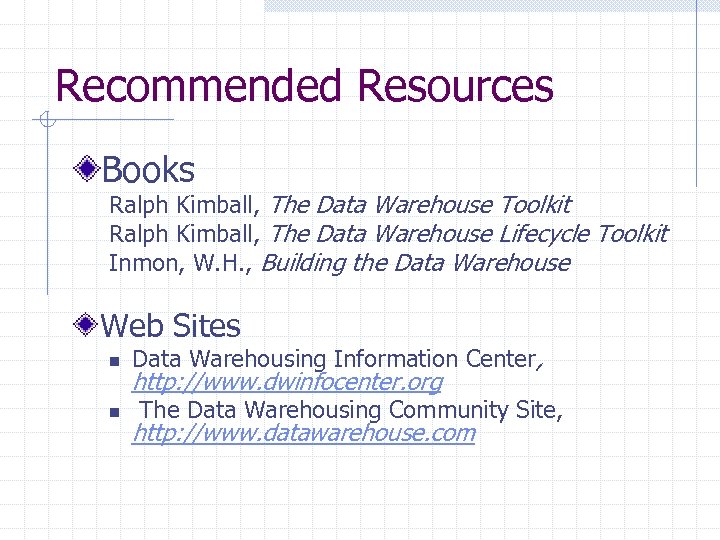 Recommended Resources Books Ralph Kimball, The Data Warehouse Toolkit Ralph Kimball, The Data Warehouse Lifecycle Toolkit Inmon, W. H. , Building the Data Warehouse Web Sites n n Data Warehousing Information Center, http: //www. dwinfocenter. org The Data Warehousing Community Site, http: //www. datawarehouse. com