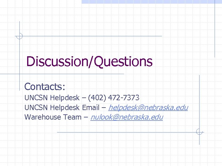 Discussion/Questions Contacts: UNCSN Helpdesk – (402) 472 -7373 UNCSN Helpdesk Email – helpdesk@nebraska. edu Warehouse Team – nulook@nebraska. edu