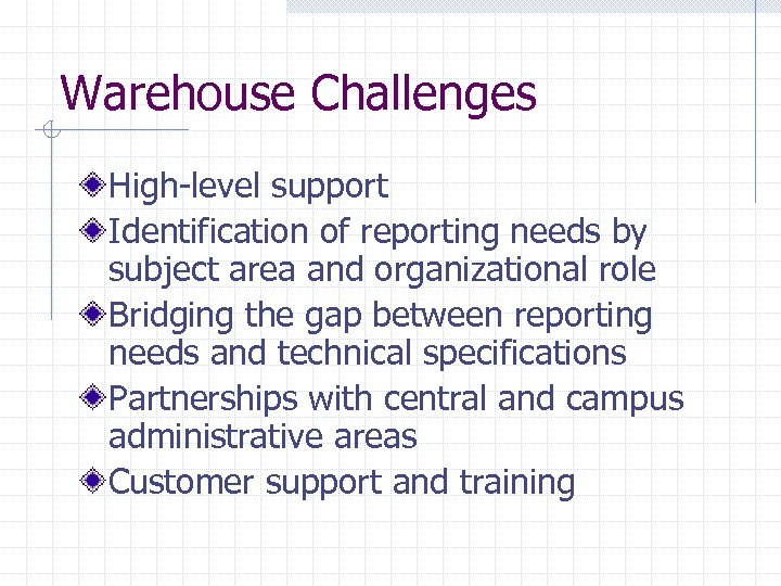 Warehouse Challenges High-level support Identification of reporting needs by subject area and organizational role Bridging the gap between reporting needs and technical specifications Partnerships with central and campus administrative areas Customer support and training