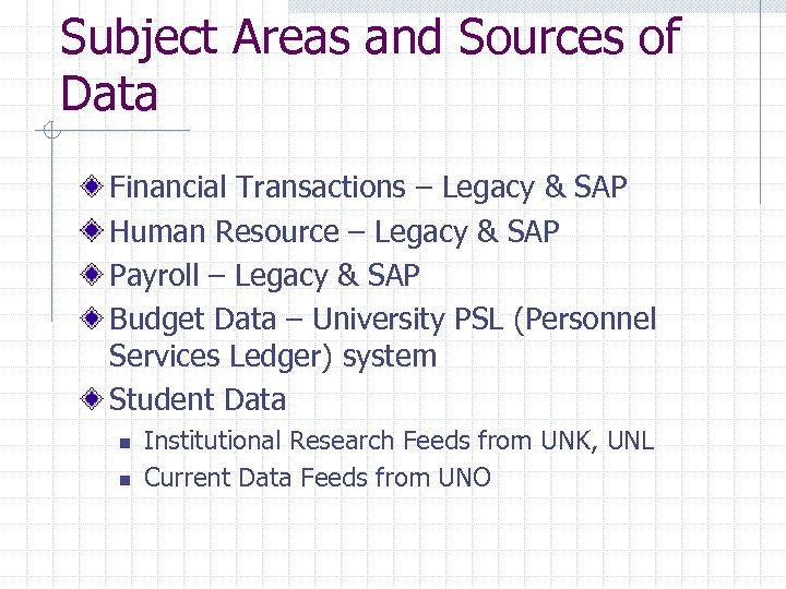 Subject Areas and Sources of Data Financial Transactions – Legacy & SAP Human Resource – Legacy & SAP Payroll – Legacy & SAP Budget Data – University PSL (Personnel Services Ledger) system Student Data n n Institutional Research Feeds from UNK, UNL Current Data Feeds from UNO