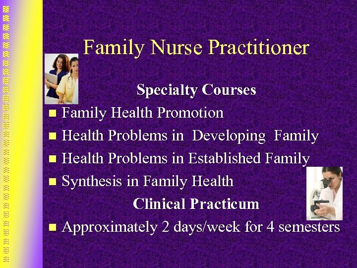 Family Nurse Practitioner Specialty Courses n Family Health Promotion n Health Problems in Developing Family n Health Problems in Established Family n Synthesis in Family Health Clinical Practicum n Approximately 2 days/week for 4 semesters