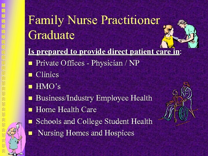 Family Nurse Practitioner Graduate Is prepared to provide direct patient care in: n Private Offices - Physician / NP n Clinics n HMO’s n Business/Industry Employee Health n Home Health Care n Schools and College Student Health n Nursing Homes and Hospices