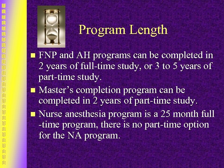 Program Length FNP and AH programs can be completed in 2 years of full-time study, or 3 to 5 years of part-time study. n Master’s completion program can be completed in 2 years of part-time study. n Nurse anesthesia program is a 25 month full -time program, there is no part-time option for the NA program. n