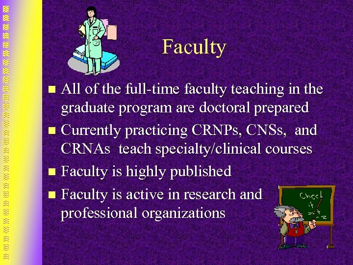 Faculty All of the full-time faculty teaching in the graduate program are doctoral prepared n Currently practicing CRNPs, CNSs, and CRNAs teach specialty/clinical courses n Faculty is highly published n Faculty is active in research and professional organizations n