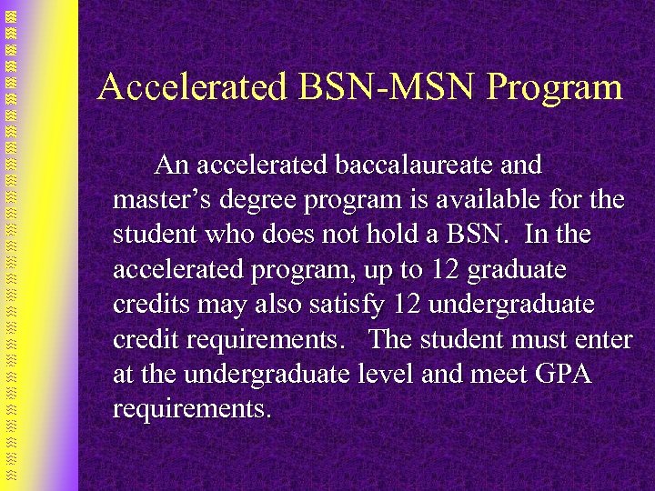 Accelerated BSN-MSN Program An accelerated baccalaureate and master’s degree program is available for the student who does not hold a BSN. In the accelerated program, up to 12 graduate credits may also satisfy 12 undergraduate credit requirements. The student must enter at the undergraduate level and meet GPA requirements.