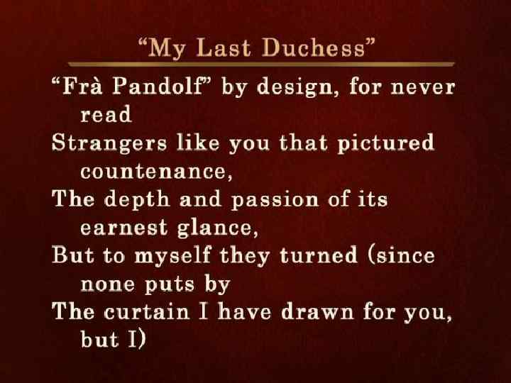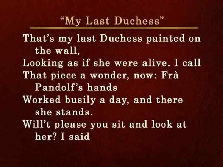 two really big standout works: dramatic monologues 'Porphyria's Lover' 'My Last Duchess. ' n fascination with abnormal psychology purposefully weird and challenging, presenting you a puzzle to solve