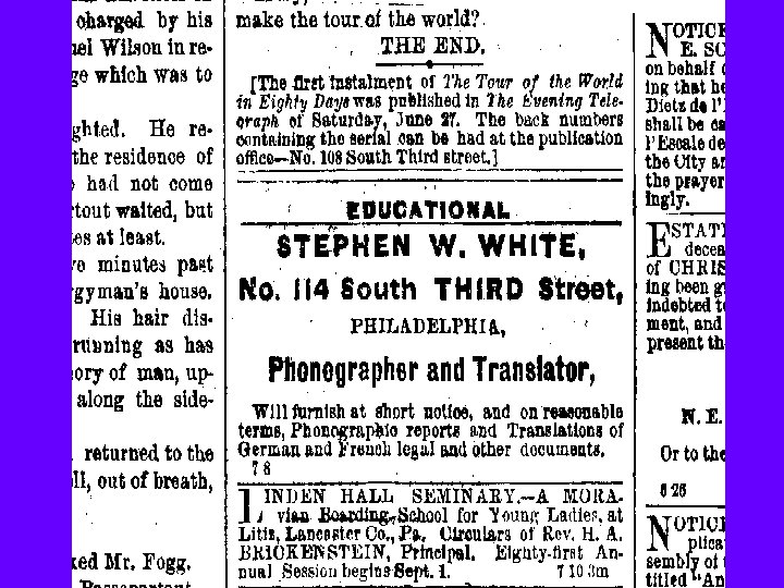 Stephen W. White, William Struthers • Operated a translation business in Philadelphia near Evening Telegraph office • “Phonographer and Translator” who "will furnish on short notice and at reasonable terms, Phonographic reports and Translations of German and French legal and other documents. " • Translated literally as in a legal document, with no embellishments