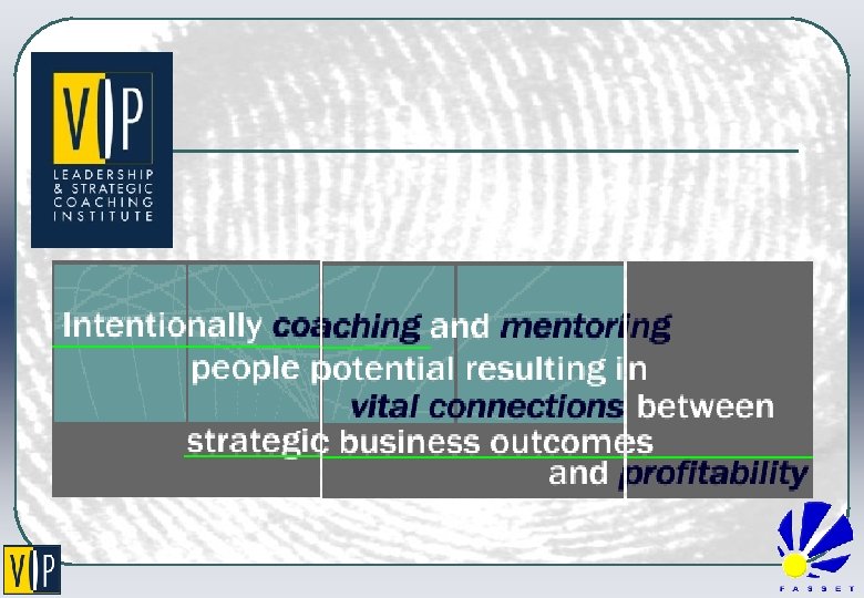 >Company Readiness Profile 1. 2. 3. 4. 5. 6. 7. 8. 9. 10. 11. 12. Diagnostic Buy-in process Alignment to profile / competencies Training on being competent Connection to company reality and structures/processes/systems Evaluation/measurement Support of the coaches/mentors Administration back-up Learning organisation + success stories Feedback loops closed Quality control Research