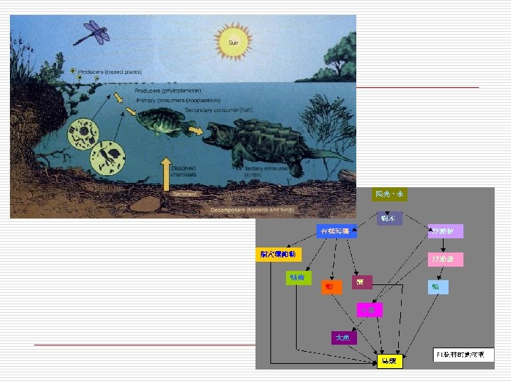 Ø Marinas / Boats l l l Intense boating activity increase the turbidity and degradation of wetlands Dumping of wastes increase the amount of nutrients and organic matter lead to eutrophication Eutrophication: nutrient level in water is much higher than the demand phytoplankton population explosion, massive death, and damage the ecosystem