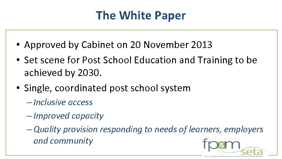 The White Paper • Approved by Cabinet on 20 November 2013 • Set scene for Post School Education and Training to be achieved by 2030. • Single, coordinated post school system – Inclusive access – Improved capacity – Quality provision responding to needs of learners, employers and community