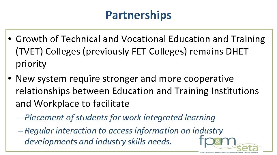 Partnerships • Growth of Technical and Vocational Education and Training (TVET) Colleges (previously FET Colleges) remains DHET priority • New system require stronger and more cooperative relationships between Education and Training Institutions and Workplace to facilitate – Placement of students for work integrated learning – Regular interaction to access information on industry developments and industry skills needs.