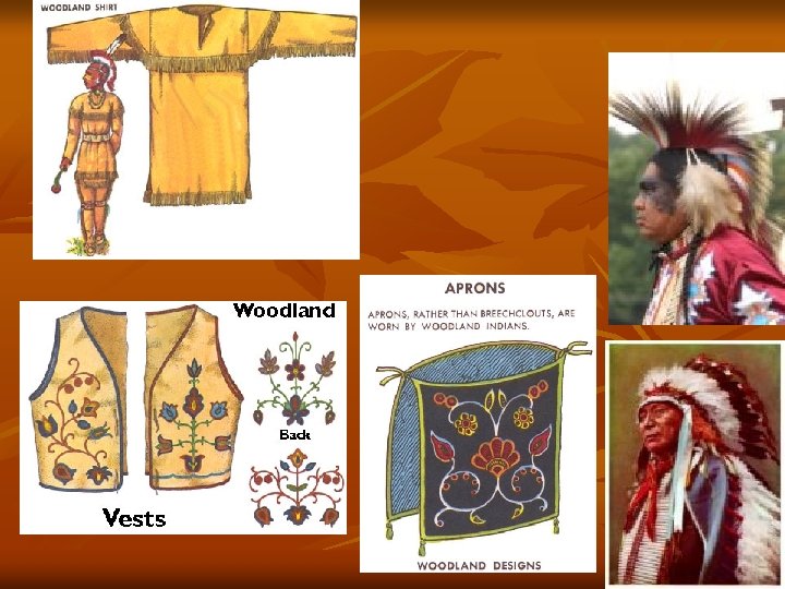 Woodland Fashion n n Numerous hours were required to make the popular deerskin summer apparel. Furs from bears, rabbits and raccoons kept them warm in the winter. Turkey feathers were a popular accessory since it is waterproof. Face painting and the men's scalp lock (with shaven side hair) were typical. Designs in the clothes were closely tied to nature