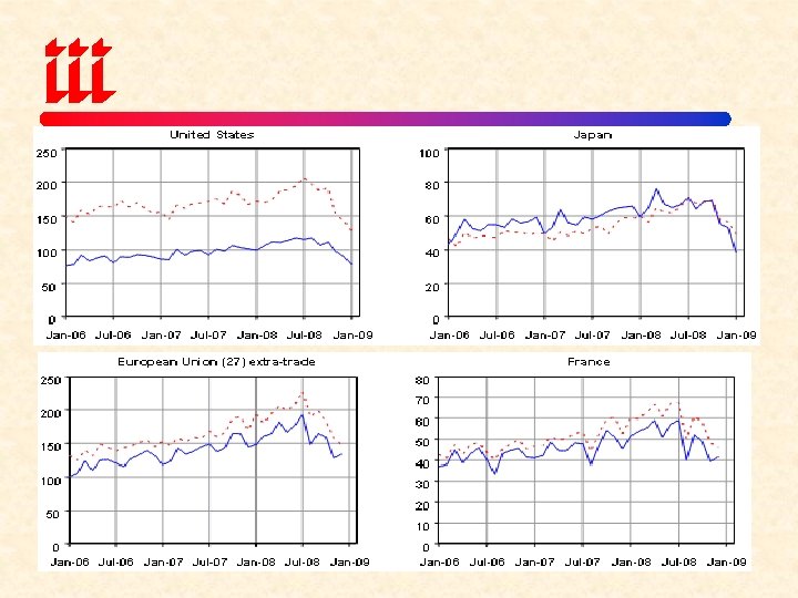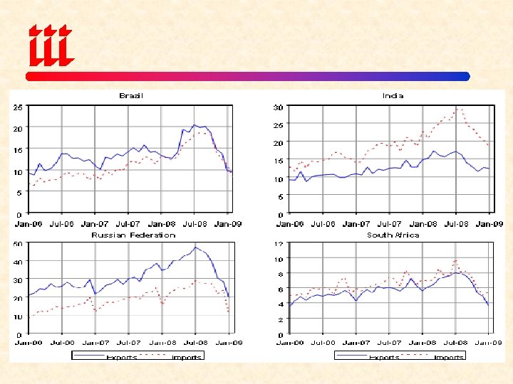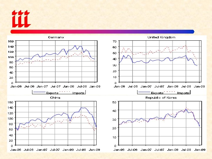 Global trade (imports and exports) fell sharply in late 2008 as major economies entered recessions. WTO estimates global trade will shrink 9% in 2009