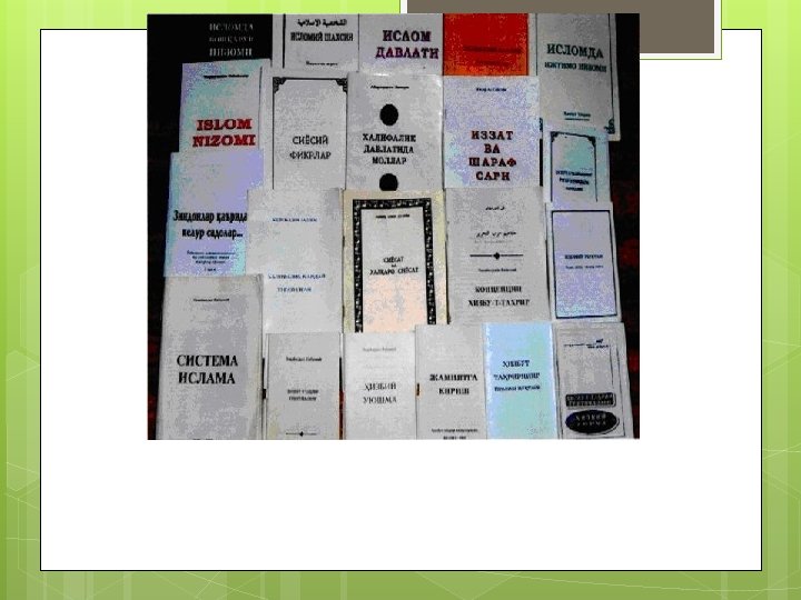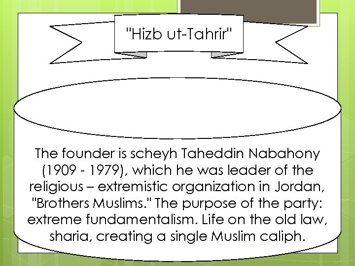 "Hizb ut-Tahrir" The founder is scheyh Taheddin Nabahony (1909 - 1979), which he was leader of the religious – extremistic organization in Jordan, "Brothers Muslims. " The purpose of the party: extreme fundamentalism. Life on the old law, sharia, creating a single Muslim caliph.