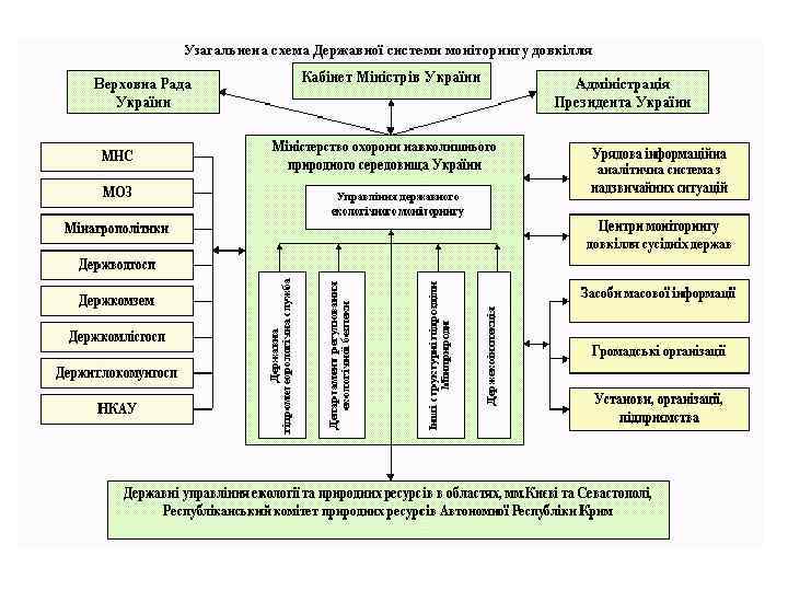 Entities of State Environmental Monitoring System of Ukraine: - Ministry of Environment and Natural Resources of Ukraine - Hydrometeorological Service - Ministry of Internal Affairs of Ukraine - Ministry of Agrarian Policy and Food of Ukraine - Ministry of Health of Ukraine - State Forest Resources Agency of Ukraine - State Water Resources Agency of Ukraine - State Land Resources Agency of Ukraine - State Service of Geology and Mineral Resources of Ukraine -Ministry for Regional Development, Building and Housing of Ukraine and their local agencies as well as enterprises, institutions and organizations that belong to their jurisdiction.