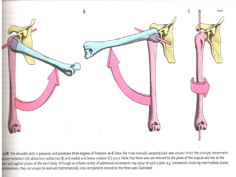 The articular cavity (cavum articulare) is a closed fissure-like space confined by the articular surfaces and capsule. It is filled with synovial fluid, a mucoid lubricant, which moistens the articular surfaces, allowing them to glide freely against each other. Synovial fluid also provides nutrients to the articular cartilage.Articular discs and menisci (disci et menisci articulares) are intraarticular cartilaginous plates of different shapes, which reduce or elim- s inate incongruity between articular surfaces. CLASSIFICATION OF JOINTS (CONTINUATION) Joints can be classified based on their anatomy or on their biome-chanic properties. According to the anatomic classification, joints are subdivided into simple and compound (composite), depending on the number of bones involved, and into complex and combination joints. Simple joints are formed by two articular surfaces (e.g. the shoulder joint, the hip joint and many other joints). Compound joints (e.g. the radiocarpal joint, etc.) are formed by three or more articular surfaces. ; Complex joints have an articular disc or meniscus (the sternoclavicular, temporomandibular and knee joints). Combination joints are groups of articulations, which are isolated anatomically, but function simultaneously. An example of this is the temporomandibular joints. According to the biomechanic classification, joints are subdivided | into uniaxial, biaxial and multiaxial, depending on the number of rotation axes they have. Uniaxial joints have one rotation axis, around which they can perform flexion and extension or abduction and adduction movements, or rotation to the outside (supination) and inside (pronation). Uniaxial articulations include hinge (elbow joint) and pivot joints (proximal and distal radioulnar articulations) (Fig.69). Biaxial joints have two axes of rotations, for example, flexion-extension and abduction-adduction. Such joints are the radiocarpal articulation (el l i p s о i d), the car-pometacarpal joint of the thumb and the atlanto-occipital joint (с о n d у l a r). Multiaxial (triaxial) joints (shoulder and hip joints) are formed by spherical articular surfaces. They can perform all types of movement: flexion-extension, abduction-adduction and supination-pronation (rotation).