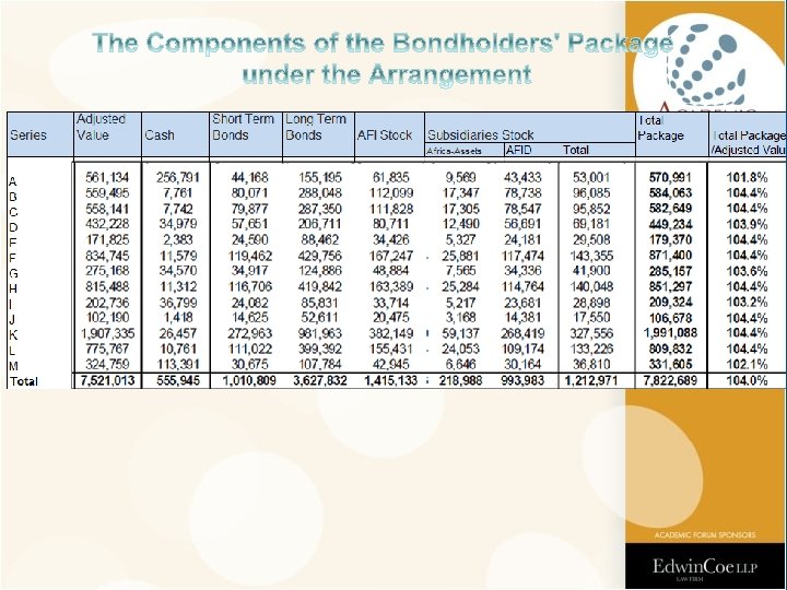 November 2009 • AFI filed with the court for voting on a proposed arrangement 1 day before Series A due date. – Filed under s. 350 of the Companies Act. – Arrangement can be approved by a voting class if approved by a majority of 75% of votes (in value). • Requested a general bondholders meeting, comprised of holders of all 13 series, for the vote. • Note: the filing accelerated all the series and thus effectively rendered AFI insolvent.