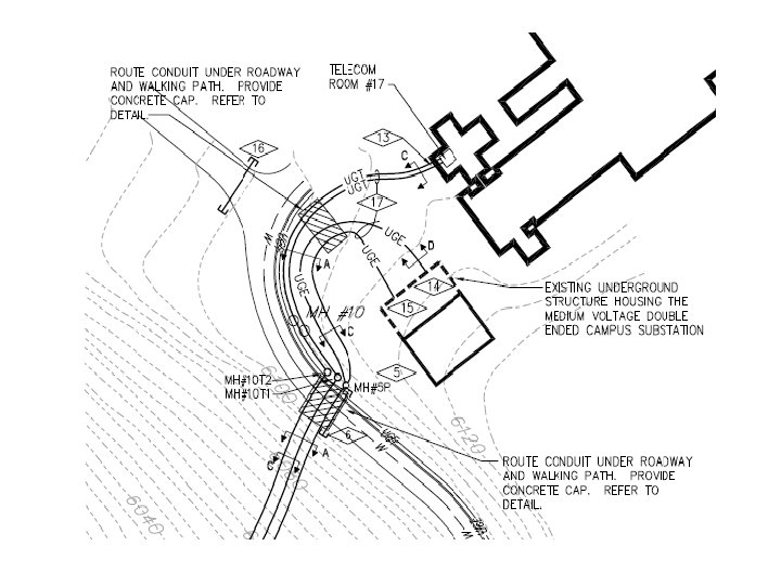 • The existing conduit and manholes running up the hill will be left in place to provide a secondary route up the hill for the electrical cabling, and will remain the primary route for communications.