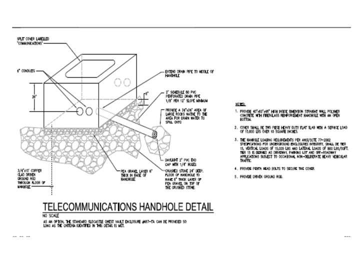 The Communications conduits will be run into handholes rather than manholes. This will make access simpler and safer. The handholes will be spaced at approximately 350’ apart to facilitate cable installation. The handholes will be • 40”x 62”x 48” with straight walls • Polymer Concrete construction, • split lids, • open bottom, • penta head bolts to secure the cover • vertical loading of 15000 lbs • Ground rod installed