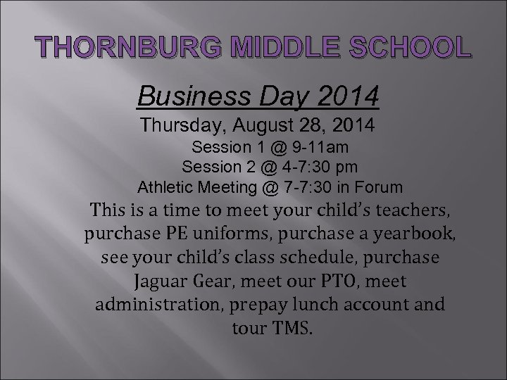 THORNBURG MIDDLE SCHOOL Business Day 2014 Thursday, August 28, 2014 Session 1 @ 9 -11 am Session 2 @ 4 -7: 30 pm Athletic Meeting @ 7 -7: 30 in Forum This is a time to meet your child’s teachers, purchase PE uniforms, purchase a yearbook, see your child’s class schedule, purchase Jaguar Gear, meet our PTO, meet administration, prepay lunch account and tour TMS.