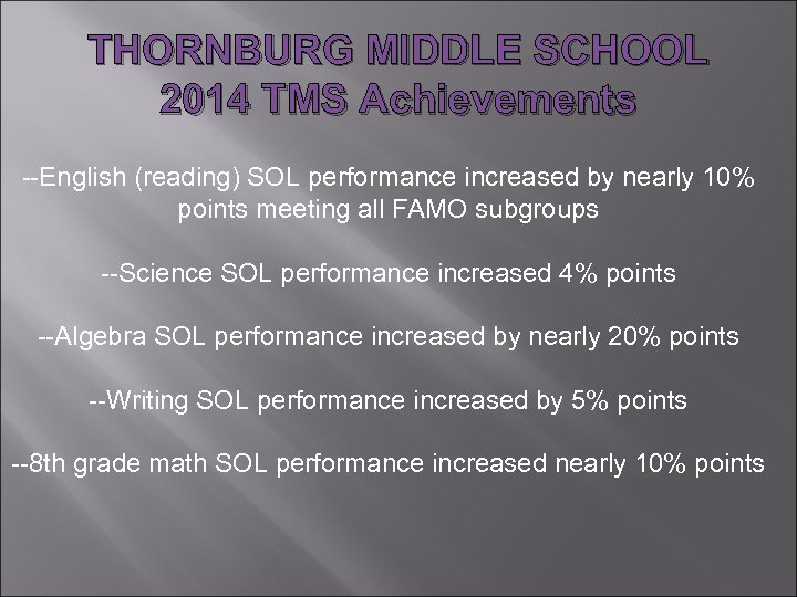 THORNBURG MIDDLE SCHOOL 2014 TMS Achievements --English (reading) SOL performance increased by nearly 10% points meeting all FAMO subgroups --Science SOL performance increased 4% points --Algebra SOL performance increased by nearly 20% points --Writing SOL performance increased by 5% points --8 th grade math SOL performance increased nearly 10% points