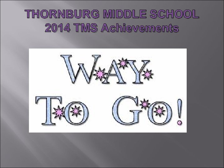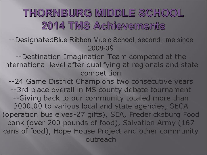 THORNBURG MIDDLE SCHOOL 2014 TMS Achievements --Designated. Blue Ribbon Music School, second time since 2008 -09 --Destination Imagination Team competed at the international level after qualifying at regionals and state competition --24 Game District Champions two consecutive years --3 rd place overall in MS county debate tournament --Giving back to our community totaled more than 3000. 00 to various local and state agencies, SECA (operation bus elves-27 gifts), SEA, Fredericksburg Food bank (over 200 pounds of food), Salvation Army (167 cans of food), Hope House Project and other community outreach