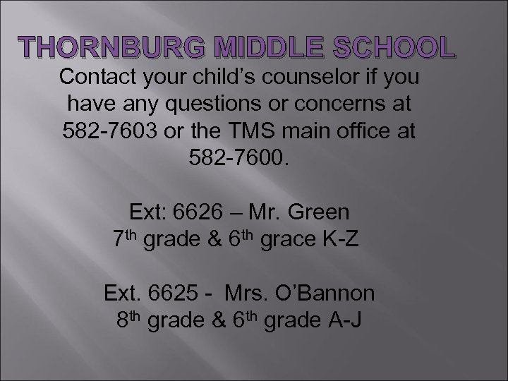 THORNBURG MIDDLE SCHOOL Contact your child’s counselor if you have any questions or concerns at 582 -7603 or the TMS main office at 582 -7600. Ext: 6626 – Mr. Green 7 th grade & 6 th grace K-Z Ext. 6625 - Mrs. O’Bannon 8 th grade & 6 th grade A-J