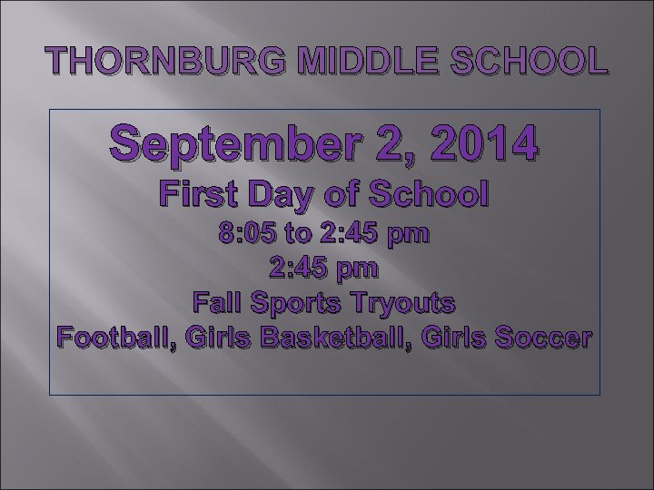 THORNBURG MIDDLE SCHOOL September 2, 2014 First Day of School 8: 05 to 2: 45 pm Fall Sports Tryouts Football, Girls Basketball, Girls Soccer