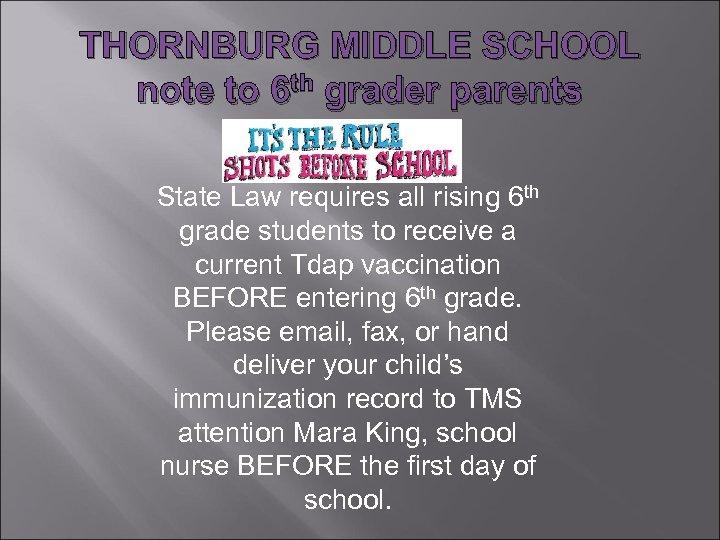 THORNBURG MIDDLE SCHOOL note to 6 th grader parents State Law requires all rising 6 th grade students to receive a current Tdap vaccination BEFORE entering 6 th grade. Please email, fax, or hand deliver your child’s immunization record to TMS attention Mara King, school nurse BEFORE the first day of school.
