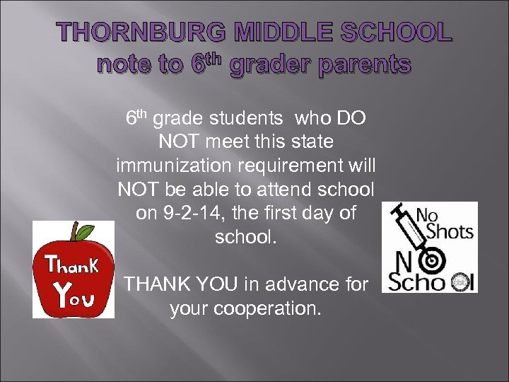THORNBURG MIDDLE SCHOOL note to 6 th grader parents 6 th grade students who DO NOT meet this state immunization requirement will NOT be able to attend school on 9 -2 -14, the first day of school. THANK YOU in advance for your cooperation.