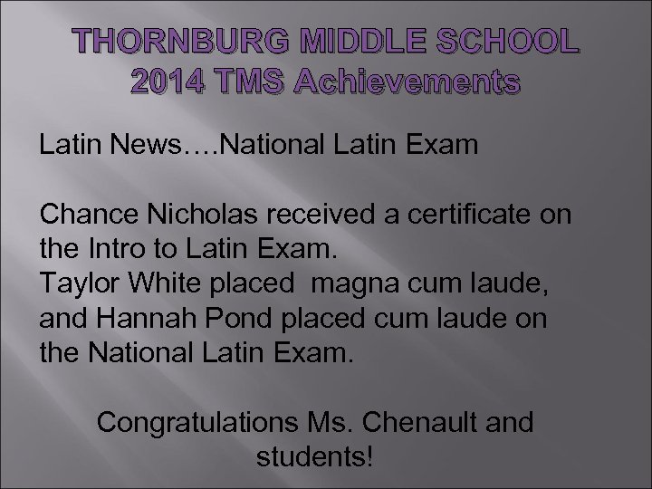 THORNBURG MIDDLE SCHOOL 2014 TMS Achievements Latin News…. National Latin Exam Chance Nicholas received a certificate on the Intro to Latin Exam. Taylor White placed magna cum laude, and Hannah Pond placed cum laude on the National Latin Exam. Congratulations Ms. Chenault and students!