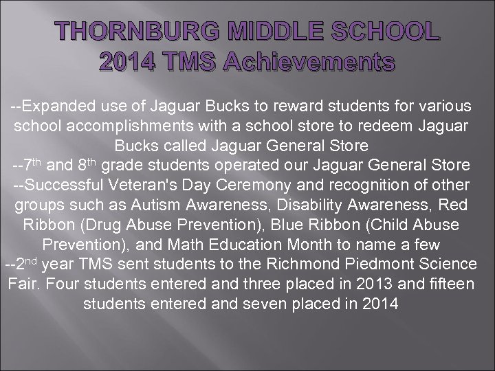 THORNBURG MIDDLE SCHOOL 2014 TMS Achievements --Expanded use of Jaguar Bucks to reward students for various school accomplishments with a school store to redeem Jaguar Bucks called Jaguar General Store --7 th and 8 th grade students operated our Jaguar General Store --Successful Veteran's Day Ceremony and recognition of other groups such as Autism Awareness, Disability Awareness, Red Ribbon (Drug Abuse Prevention), Blue Ribbon (Child Abuse Prevention), and Math Education Month to name a few --2 nd year TMS sent students to the Richmond Piedmont Science Fair. Four students entered and three placed in 2013 and fifteen students entered and seven placed in 2014