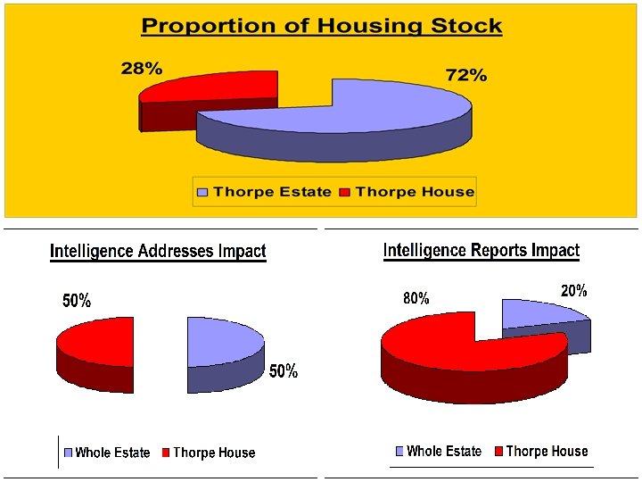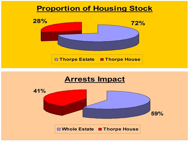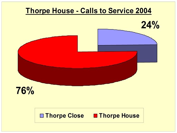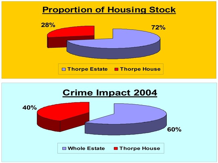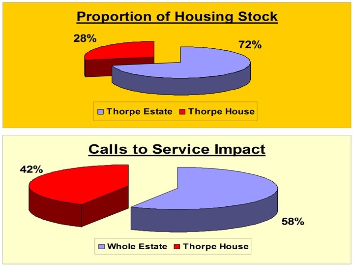THORPE HOUSE • 35% of dwellings are void • Dwellings used as postal addresses & subjected to illegal occupiers • Legitimate tenants abandon property leaving keys for persons unknown • Dwellings used as ‘open houses’ • 60% of tenants warned regarding anti-social behaviour • Dwellings difficult to let – 4. 6 offers made on each dwelling • 64% of tenants do not sustain tenancy for more than 2 yrs